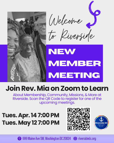 Join Rev. Mia on Zoom to learn about membership, community, missions, & more at Riverside. Register on Zoom for one of the upcoming meetings.