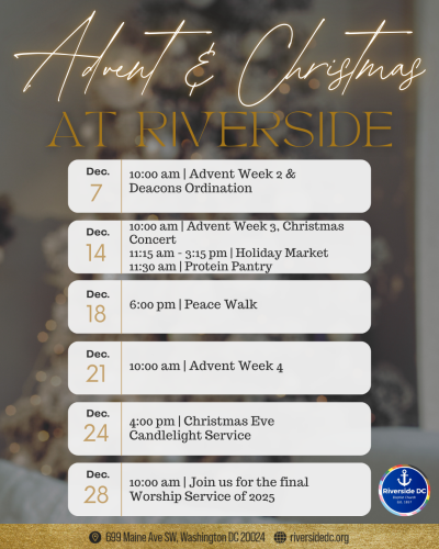 Be sure to save the date for all the community experiences we have at Riverside this month. Please note that Sunday Dec. 28 will be our final worship service of 2025.