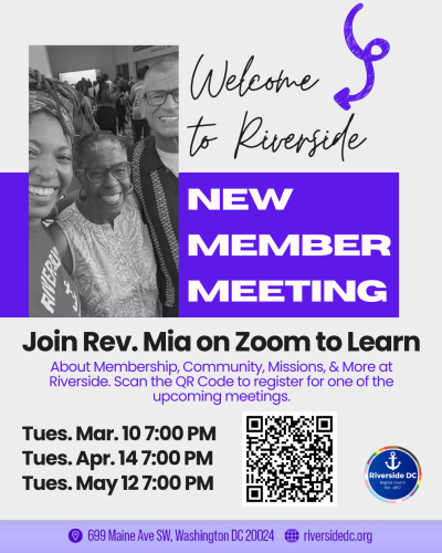 Join Rev. Mia on Zoom to learn about membership, community, missions, & more at Riverside. Register on Zoom for one of the upcoming meetings. Scan the QR code or use the link here to register.