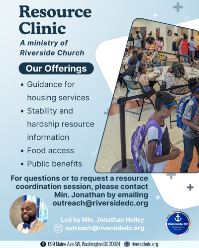 The Resource Clinic is a community-centered ministry offering guidance for housing services, stability and hardship resource information, food access, and public benefits. It connects individuals with trusted programs across DC, Maryland, and Virginia, and provides one-on-one help navigating applications and referrals.