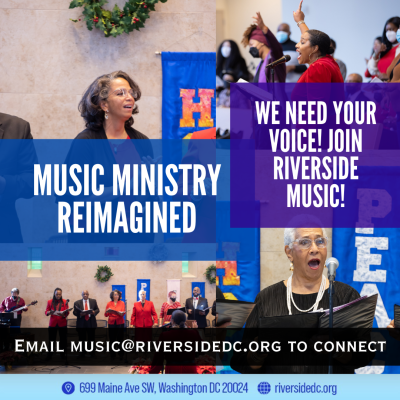 is marked by participation. We are blessed to be led by song leaders who lead us in an initial time of praise and song, offering their voices in this time of spiritual preparation. At Riverside DC, we believe that liturgy is the work of the people. The congregation is not an audience that expects a choir or music program to entertain, but the “first” choir. Many times throughout the year, the choir provides special music, especially for holy celebrations like Christmas and Easter.