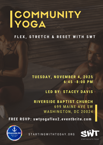 Stretch, flex, and reset with SWT in partnership with Riverside Baptist Church. Please bring your own mat and towel.